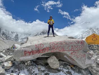 "I snapped this photo of my son at Everest Base Camp. We took a couple other photos of the magazine at the Khumbu Climbing Center and on top of Kala Patthar, but this one was the coolest." – Mike Wangsmo.