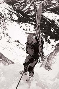 In late autumn of 1987, Bozeman climbers Alex and Jennifer Lowe were the next to pioneer a new route on the mountain. Spotting ice streaks from Lone Mountain, the couple tackled the nearly 2,000-foot concave north face. When the route is in good condition, it begins with numerous ice-coated striated cliff bands that offer little protection. It involves at least one difficult vertical pillar and finishes with steep, thin ice in the only couloir that penetrates the vertical 400-foot summit cliff. In Big Sky Ice, which rates the route Grade V WI4+, Geoff Heath describes this ascent with Dougal McCarty: “Most of our climb involved short pitches of rock followed by traverses along steep snow bands to the easiest looking way through the next rock barrier. The snow was loose powder, difficult to get around in… The big surprise was that the rock turned out to be of fairly good quality conglomerate.” Kris Erickson solo-climbed Lowe’s north face route in 12 hours in the late 1990s.