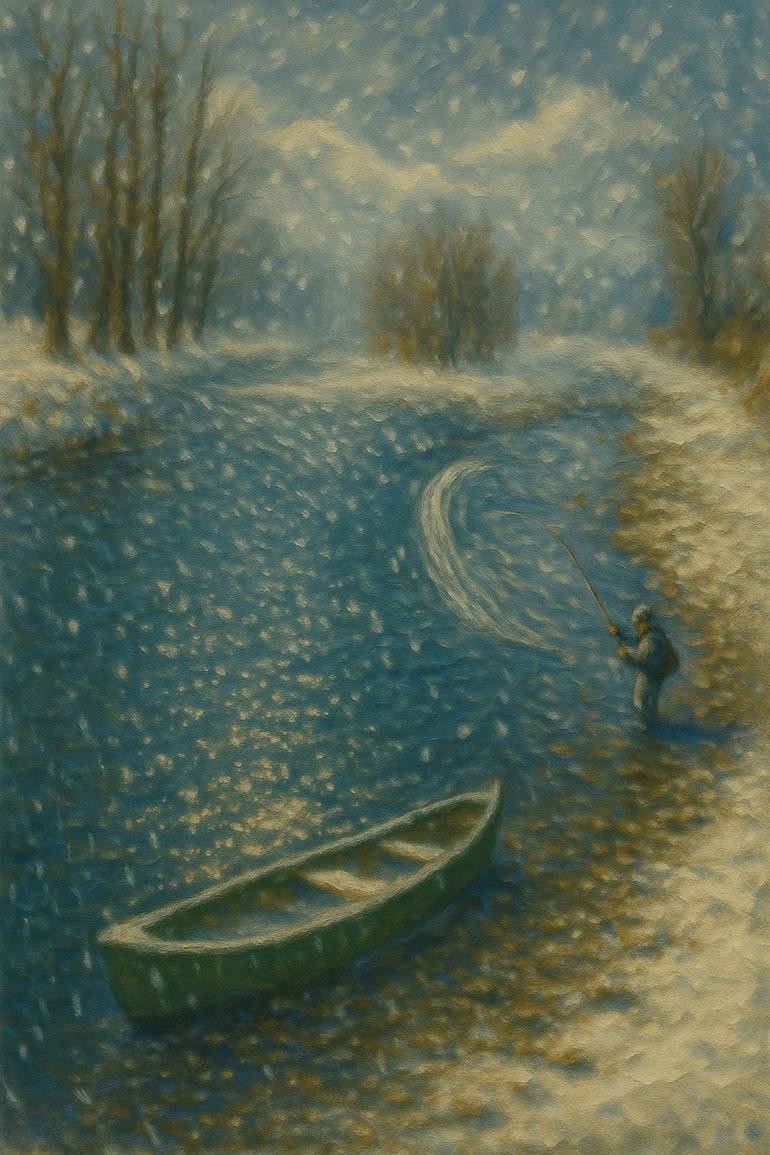 Back in the canoe, we yell at each other a few times (that’s what you do in a duo-paddled bucket that doesn’t turn because it’s designed for lakes). My hands are numb, but I dig in J-strokes as Casey casts another streamer into a frothy eddy. I hear a yelp and watch him fight a thick rainbow. Its scales are just a shade darker than the snowflakes that have started to fall. I smile as I maneuver the canoe back into the current. Now he owes me one.