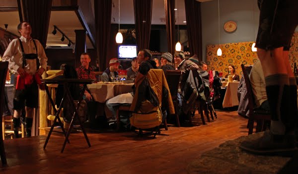 For dinner, we shot over to the new Fondue Stube nestled in Chet’s Bar and Grill. The description of “fondue served by singing German waiters in lederhosen” left us a little skeptical, but as soon as Yogi and Ahnold introduced themselves, we were sold.