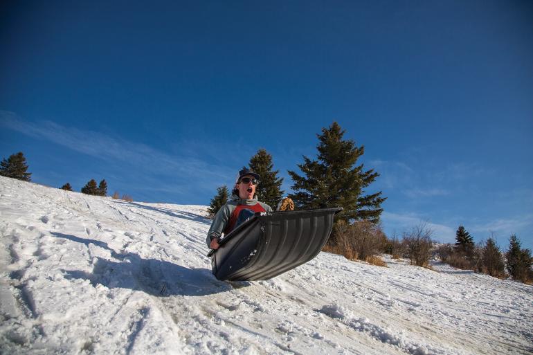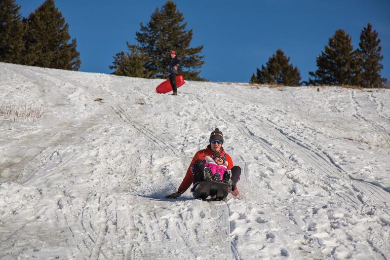 It doesn’t get better, or more nostalgic, than barreling down a snow-covered hill on a piece of plastic with the expectation—nay, intention—of crashing. The beauty of sledding lies both in its simplicity and accessibility, as it requires no skill, no fancy gear, and no level of physical aptitude beyond walking uphill. Anywhere with a suitable incline will do, and there’s plenty of fun to be had in-town at Peets Hill, the Snowfill Recreation Area, the Regional Park, and Langohr Campground up in Hyalite.