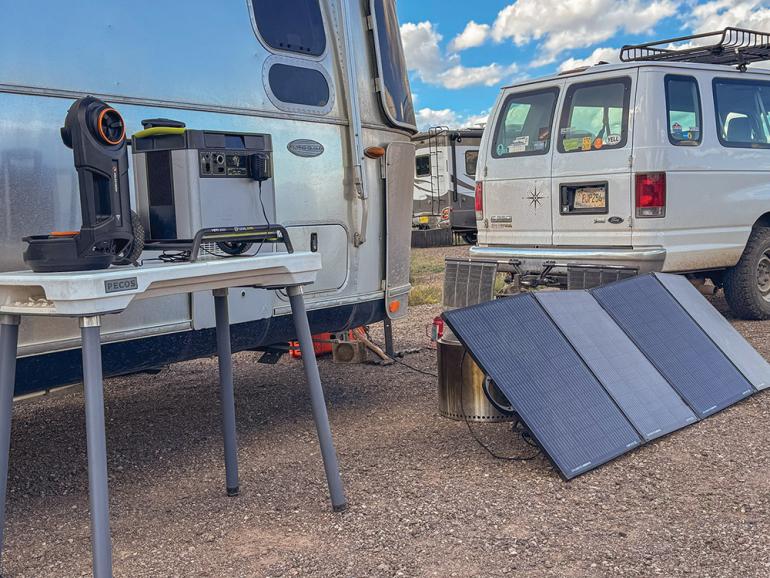 As mentioned, driving charges the batteries while traveling; but when camped in one place for several days, you’ll need a different way to keep them full of juice. When it’s sunny, I deploy a Zamp 180 watt solar panel and a 300 watt Goal Zero array. These charge both the Airstream onboard battery bank and my Goal Zero 3,000 watt solar generator. With decent sun, it keeps all systems running efficiently.