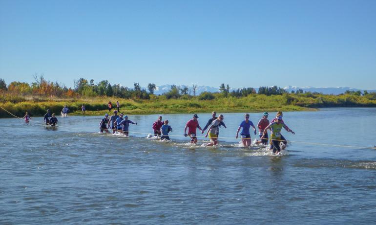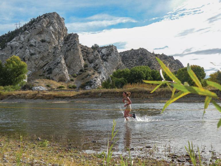 We ran to the river with nervous anticipation. It was always cold, but the water crossings added a memorable challenge to the race and made it stand out. In 1983, we made a beeline toward the river, running over the railroad tracks and crashing through downed trees and thick brush. After two racers sprinted in front of an oncoming train some years back, Burlington Northern Santa Fe Railway officially forbade runners from crossing the tracks. Now a circuitous trail guides racers under them. Dipping under the railroad trestle, marked as Colter’s Beaver Dam, gave us our first feel of cold water and muck. A short burst of speed later, and we had reached the Gallatin River.