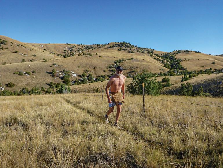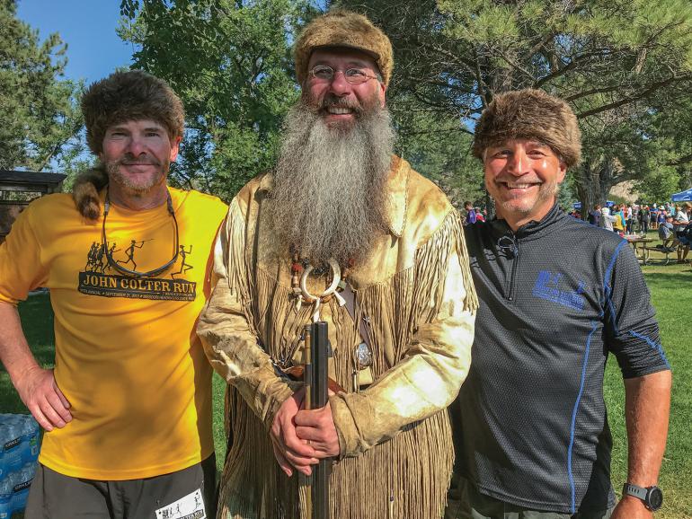 After trekking more than a mile on pavement, we begin climbing a long, steep hill leading to a stretch of dry grasslands and cactus—country reminiscent of what Colter crossed as he raced from the Jefferson to the Madison River. The reenactment Colter is given a 100-yard head start. He is chased up and down hills throughout the race, and prizes are awarded to runners who pass him. As in all races, this is a battle for position. The only position the original Colter could afford to be in if he was to survive was first.