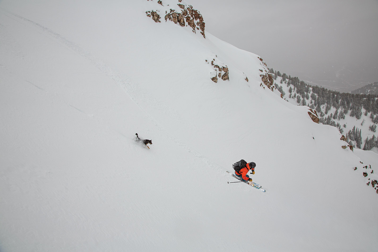 Over the edge we went, dropping like hawks through the gloaming, into the steep bowl that fell a thousand feet to the dark forest below. Much snow had fallen over the last few days and the bowl was smooth, deep, and trackless as we spiraled down into the dusk. With each turn, the snow flew over my shoulders and made hushing whispers against my knees. Over my shoulder I saw Pukka bounding behind me, arcing from the snow like a golden fish from the darkening sea.