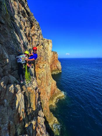 "We celebrated our three-year belated honeymoon and Boogie's completion of nursing school by adventuring to Portugal to indulge in gastronomical decadence, opulent local wine, and picturesque climbing on superb limestone rock along dramatic coastal cliffs. We snapped this shot on a bluebird day climbing in Sagres with a glassy Atlantic ocean behind us. While it was no alpine experience, the ocean served as the most meditative backdrop to an afternoon of sun, rock, and reading the latest issue of Outside Bozeman."