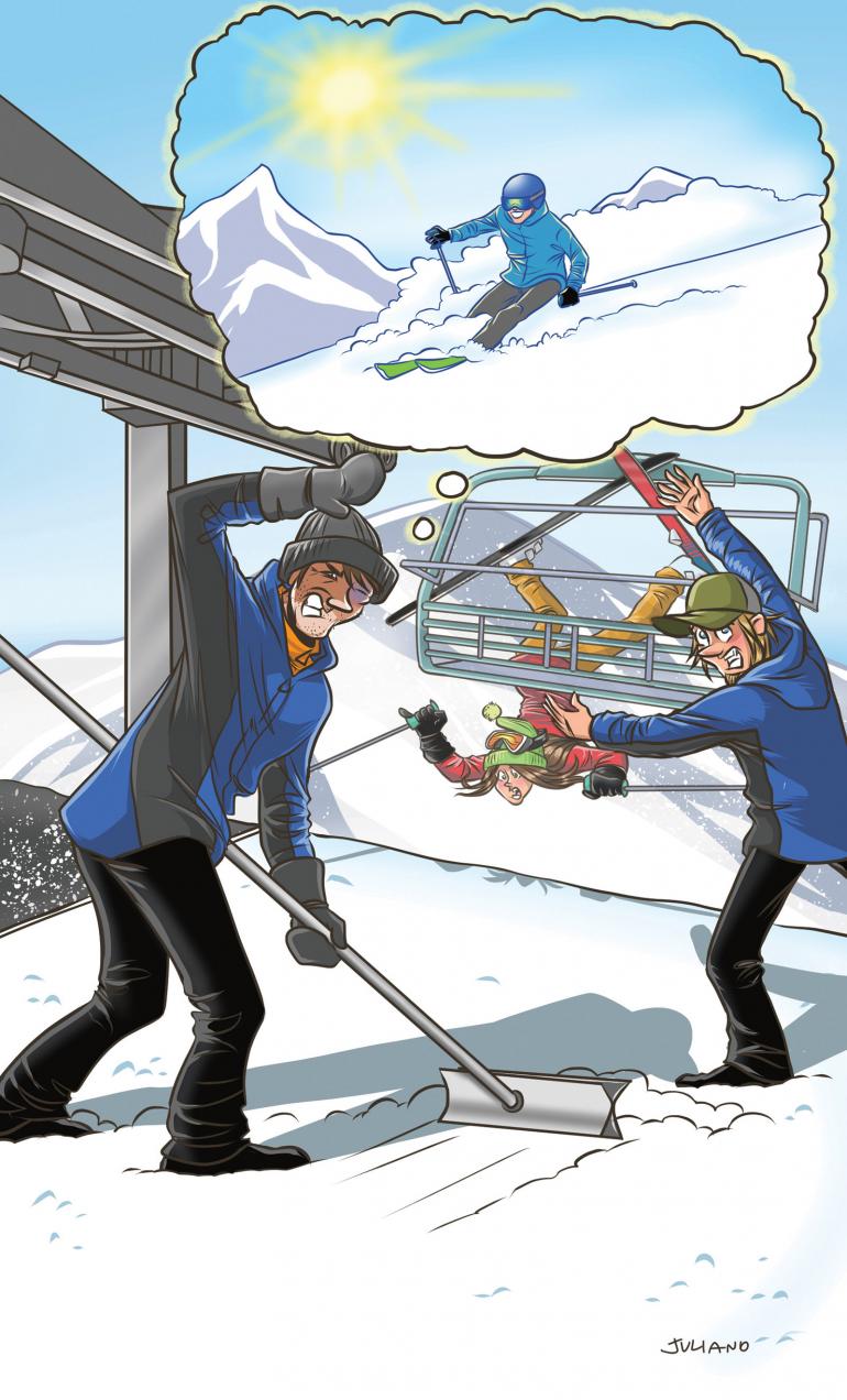 By mid-afternoon, the sun’s intense reflection has fried your one exposed retina—what a horrible day to forget sunglasses—and your meathead partner, Thor, vehemently refuses to turn down his Swedish death-metal playlist, worsening your already splitting headache. I knew shouldn’t have stayed for that last round at the Crystal. It’s too busy for the “ride break” you’d been promised, but who cares—you’re too nauseous anyway. Inside the lift shack—a.k.a. Chair Traffic Control Tower (which reeks of microwaved fish, body odor, and airing-out Sorel boot liners)—you watch patrollers carve up the mountain like action heroes, while instructors feign laughter to milk more tips for their already-swollen pocketbooks. Maybe you should’ve tried for a red or green jacket instead of resigning yourself to a measly two days of skiing a week. But then again, something magical happens when the last chair comes to a stop—the mountain quiets, the alpenglow fades, and the snow, like a Russell Chatham lithograph, shimmers under the last light of the day. Maybe this is what it’s all about. You’re jostled from your idyllic musing by the sound of the lift screeching to a halt. Outside, Thor’s fumbling with a woman in a pink jumpsuit dangling upside-down from a chair like a Barnum & Bailey trapeze act gone wrong. “A little help here!” he meekly calls over her screaming. You, while wishing you had a tranquilizer gun to calm her down with, help with the rescue, but the day ain’t over yet—you’ve still got to take down the maze. Nope, you do not get paid enough for this crap.