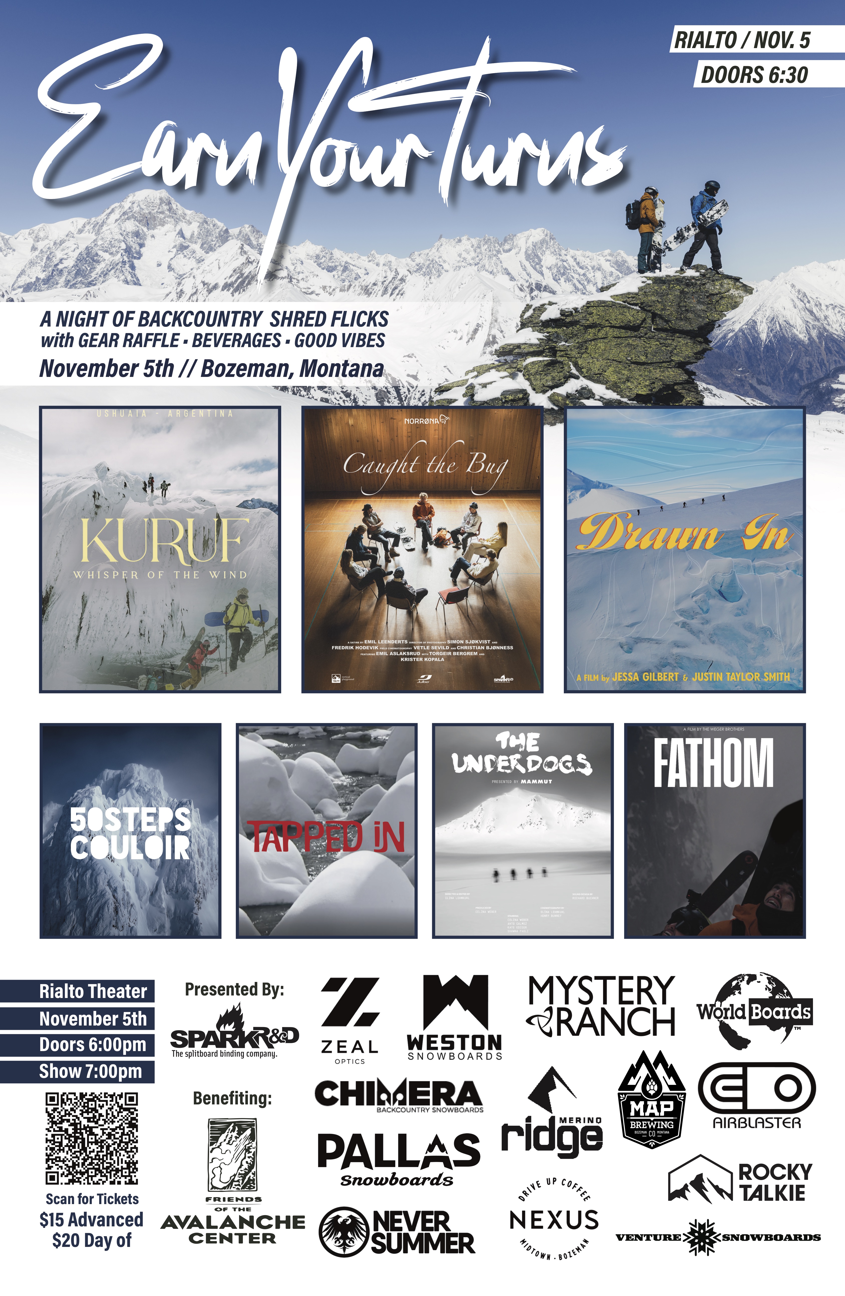 Grab popcorn and some buddies to support Friends of the Gallatin National Forest Avalanche Center with a night of seven short films all about splitboarding. Get your tickets early and be automatically entered for a chance to win a Jones Frontier 159cm Splitboard. Must be present to win.