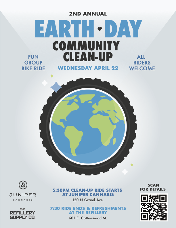Join Juniper Cannabis and the Refillery for an Earth Day ride & clean-up. Celebrate the outdoors, connect with neighbors, and give back to the place we all call home. You'll meet at Juniper, then head out for a group ride through the neighborhood, stopping to pick up litter and clean up the surrounding area. Whether you’re an experienced rider or just want to cruise with the group, everyone is welcome. Bring your bike, bring a friend, and help show some love to our local trails, streets, and public spaces.