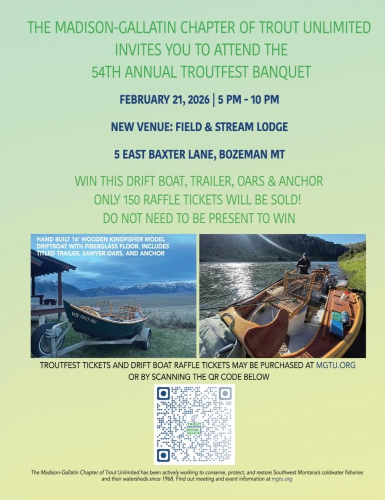 Join the Madison-Gallatin Chapter of Trout Unlimited to help conserve, protect, and restore our area's rivers and streams at their one and only annual fundraiser. Enter the silent auction for a chance to win a 16' drift boat and more.