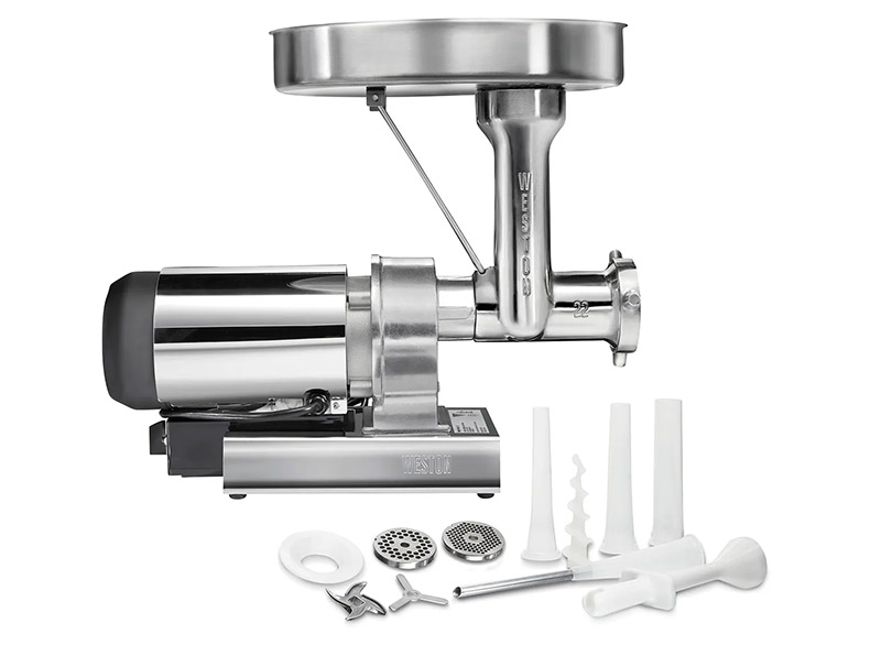 The grinder also doubles as a sausage-stuffer, and comes with several accessories to expand your horizons. All in all, if you’re looking for a sleek, powerful, reliable, and easy-to-clean grinder that will last, the Weston #22 should be at the top of your list.