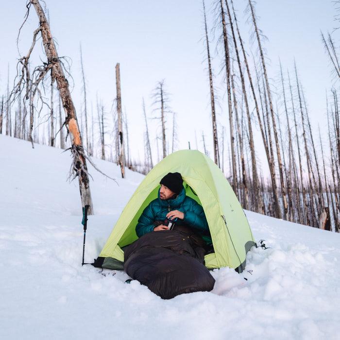 Another concern is weight. Without a lightweight setup, you're not going to get very far from the vehicle—trudging through snow is taxing, whether you're on skis, snowshoes, or even afoot on a trail. So you can't just throw a few heavy wool blankets on your back, lest you be so pooped that you collapse at your destination, unable to cook a nice dinner, admire the sunset, and properly set up camp for the long, cold night ahead.