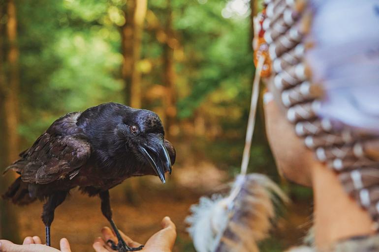Generally lacking a Western concept of hell or the devil, Native American cultures are perhaps most embracing of the raven’s foibles. Natives have long acknowledged the raven’s intelligence and bearing upon the human condition, sometimes in a role as wise trickster. The Crow, or Apsaalooke Tribe, of the Northern Plains is more properly translated as “People of the Raven.” Pacific Northwest native peoples deeply incorporate the raven as well, building the bird into creation legends and as a major clan icon.