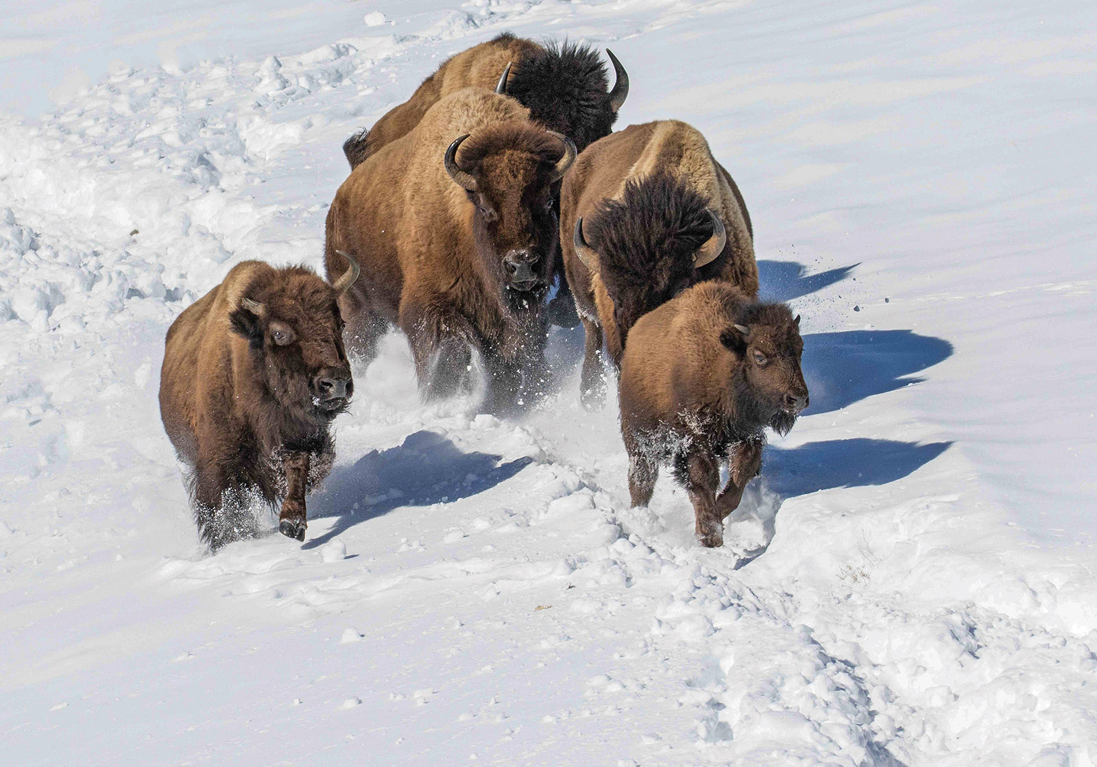 One such example is the bison, whose woolly winter coats keep them warm through the coldest of spells. Their behemoth size and causal cadence are deceptive. When urge strikes, these ungulates can move with surprising speed and agility, using their large heads and powerful necks as plows as they run, charge, and lumber through layers of snow. Once, as I was snowshoeing around Morning Glory geyser, I watched as a bull bison made his way down the snow-packed boardwalk. My anticipation mounted as he approached a fence, and I braced for him to knock it down. But he caught me by surprise. Instead, he gracefully leapt over it from a standstill—not touching the fence or the pool—before disappearing like a phantom into the nearby woods.