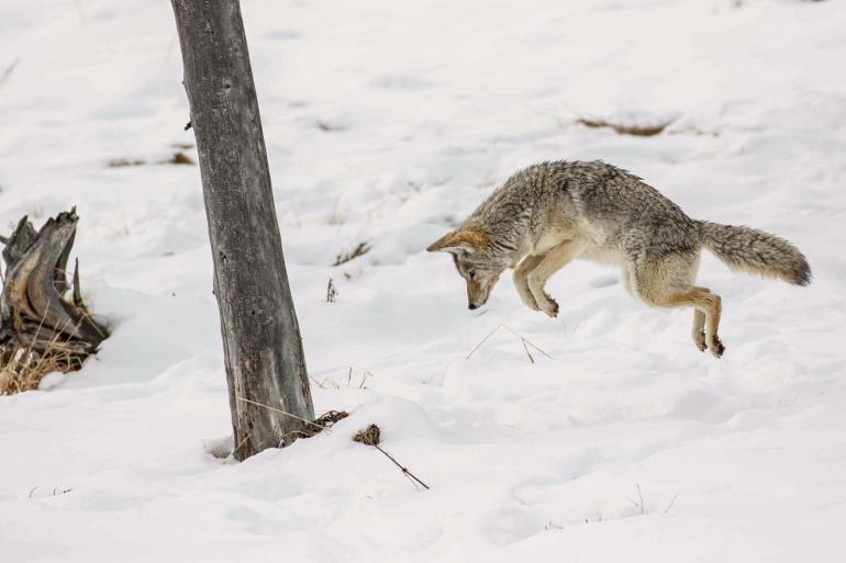 Foxes and coyotes use their keen sense of smell and the pouncing power of their hind legs to survive Montana winters. Watching them hunt is always a delight. Many times I’ve sat with numb fingers on the shutter release, waiting as they sit still and listen to prey moving beneath the snow. When their ears perk up and their hind legs tense, I know the pounce is imminent. I’m practically holding my breath as not to cloud up my viewfinder, when suddenly their pounce power kicks in and the upward lift of pure momentum sends them airborne. With a beautifully arched body, the canine employes its athleticism in a perfectionist dive and hits the snow head-on. I once watched a coyote perform this sequence for over an hour, catching a rodent every 20 minutes. When we departed, we were both content—it with a full stomach, and me with the fortune of witnessing it.