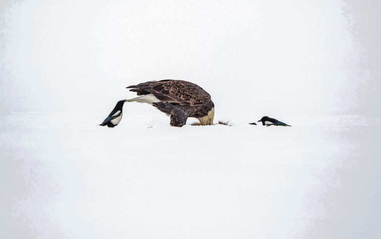 Eagles display their athleticism as they perform their flight skills, catching fish and protecting their meals. With a six-foot wingspan, they charge other birds—mischievous magpies, ravens, even other eagles—as they deftly defend their meat and move across the snow. The deer carcass is their trophy and certain cuts of the meat are reserved for their mouths only. However, the magpies have learned to team up against the eagles and steal a bit of flesh in the process. One pecks the eagle’s tail-feathers, distracting it and allowing another to sneak in and grab a morsel. While it may look playful, each of the different birds wants its share, and cautionary antics which frequently take place are actually based in survival.