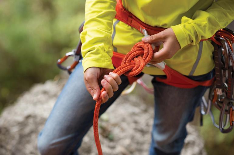 The double figure-eight is a climber’s bread and butter. It’s used to connect the harness to the rope—a pretty dang important connection point. Fortunately, it’s simple to tie. Once you’ve made the initial loop and strung the rope through the harness, just be sure to retrace it exactly the same way. Have a friend check your work. Like the bowline, the double figure-eight can be used to create a temporary loop at the end of any rope or cord—but it’s more streamlined, so lends itself to attaching a carabiner, among a myriad of other applications.